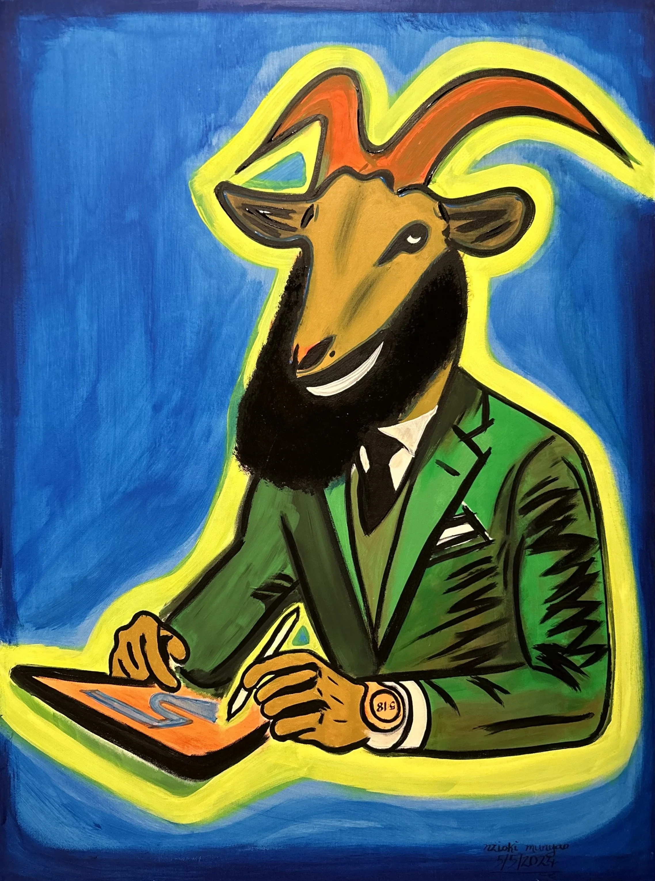 As I was creating this piece, I envisioned a vibrant, confident figure—a goat in a sharp suit, calmly sketching its masterpiece. This goat represents each one of us, diligently working on our own life's canvas, shaping it with every decision, every moment of creativity, and every challenge we face. The bold colors and dynamic lines reflect the energy and potential within you, urging you to recognize your own greatness.